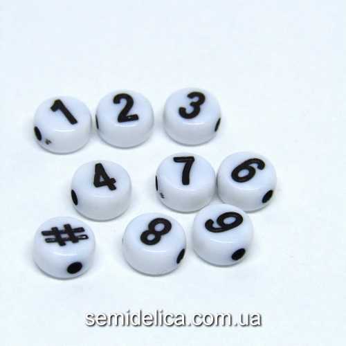Характеристики товара: Бусины Цифры 7х3мм, плоские белые с цифрами