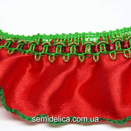 Характеристики товара: Лента Рюша 4,5 см, атласная красная с зеленым