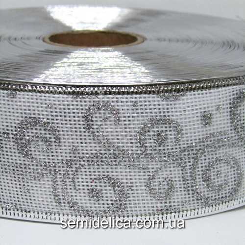 Лента новогодняя, сеточка с проволочным краем 5 см, белая с серебряным рисунком